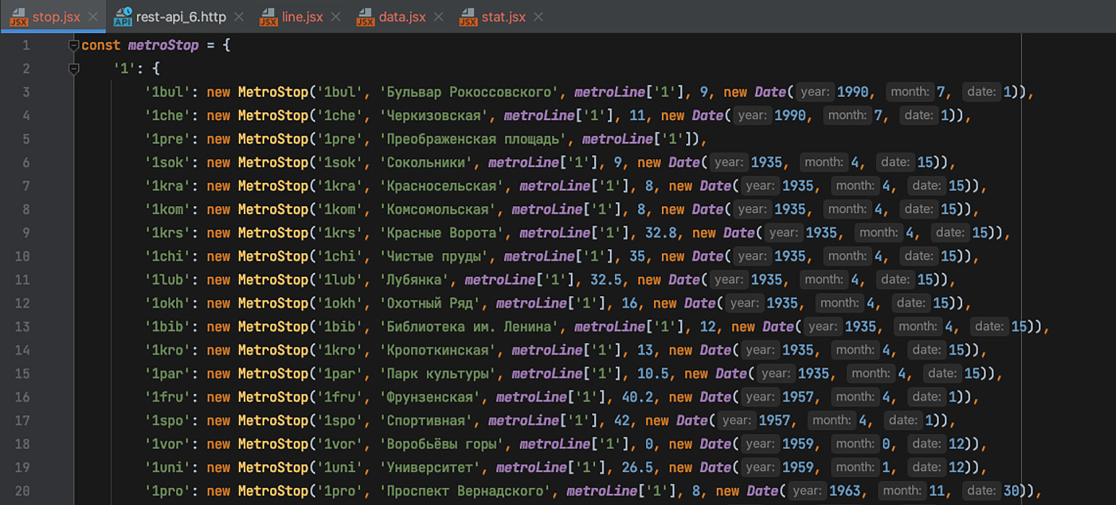 Каждому маркеру станции нужно было дать уникальное имя. Я просто назвал их цифрой линии + 3 буквы латиницей. Такой же уникальный ключ станции должен быть и в будущих данных.