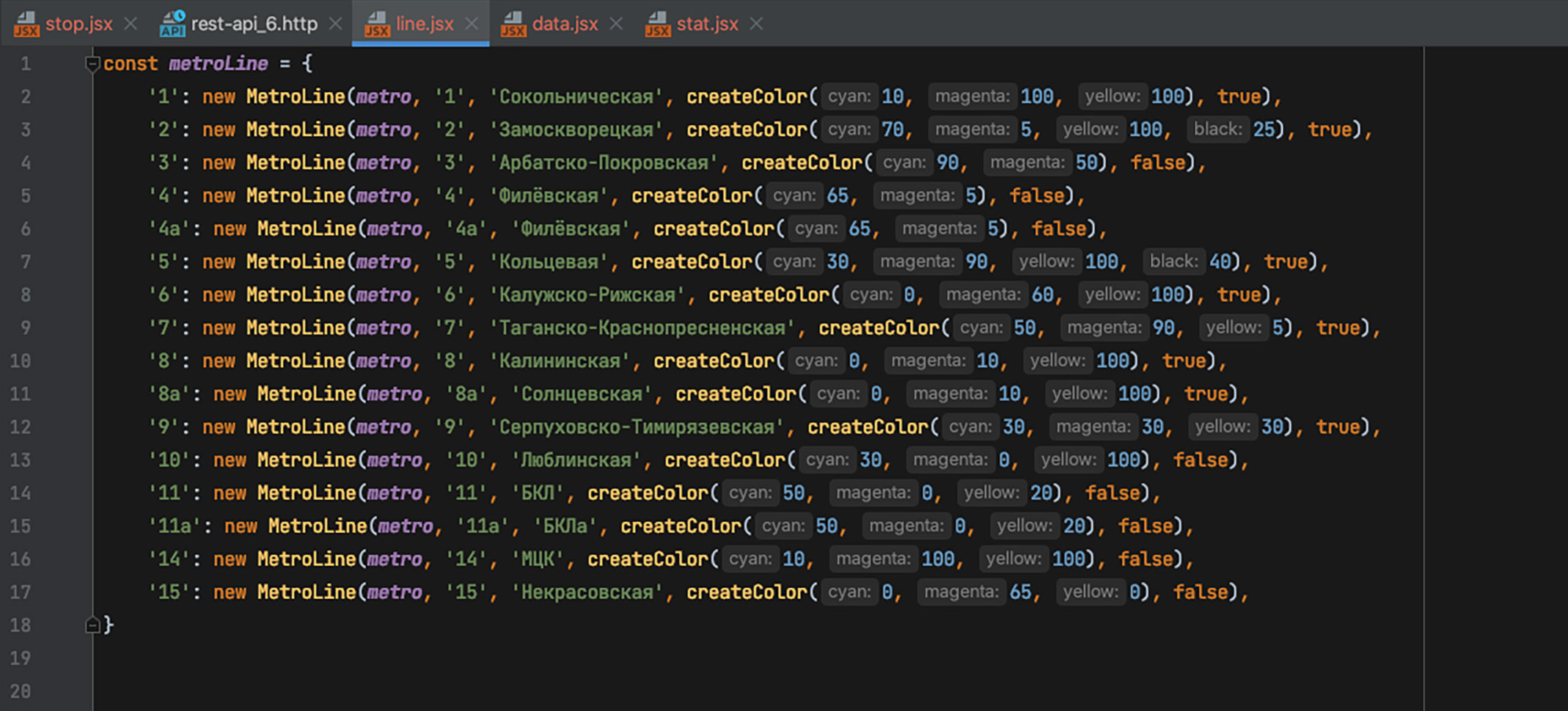 Объектная модель линий и станций, а также все данные по ним: цвета, связность, уникальные ключи станций, по которым необходимо искать соответствующие маркеры на макете — у меня были. Поэтому тут всё прошло быстро.