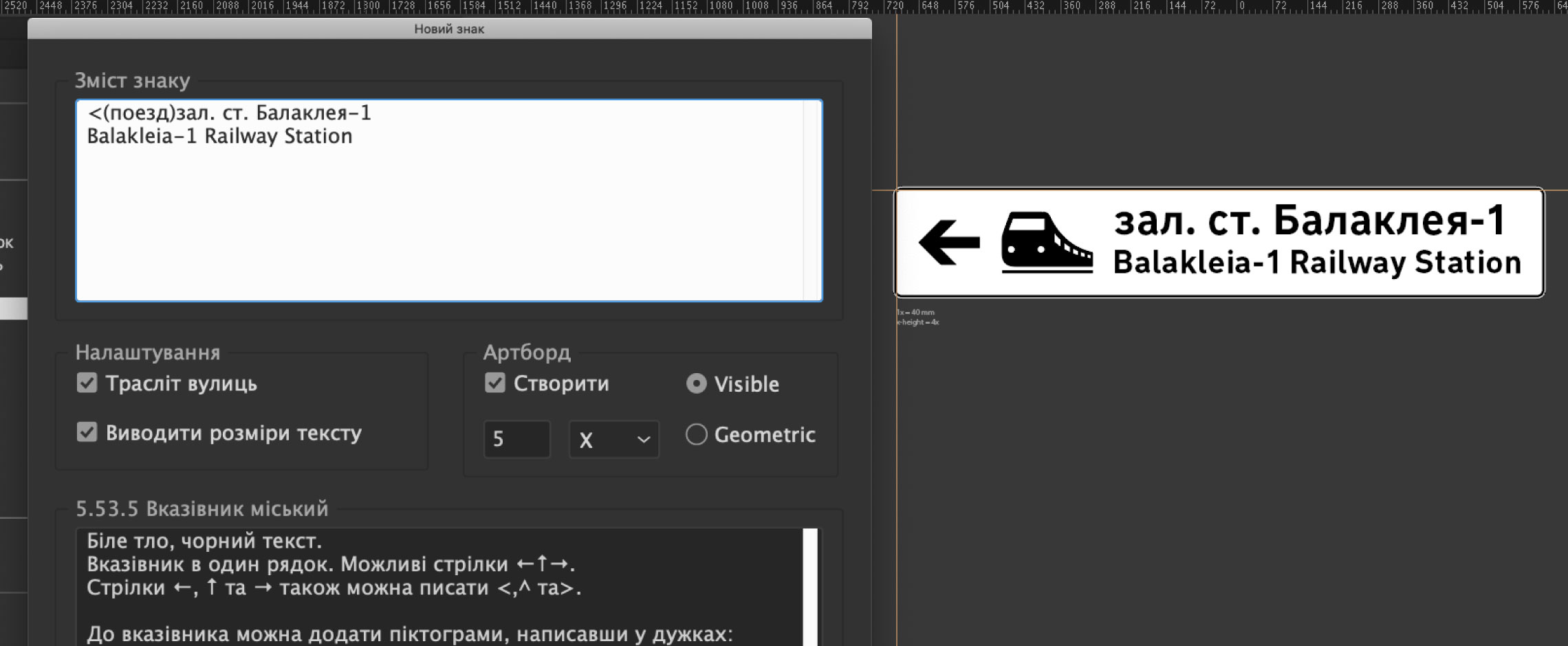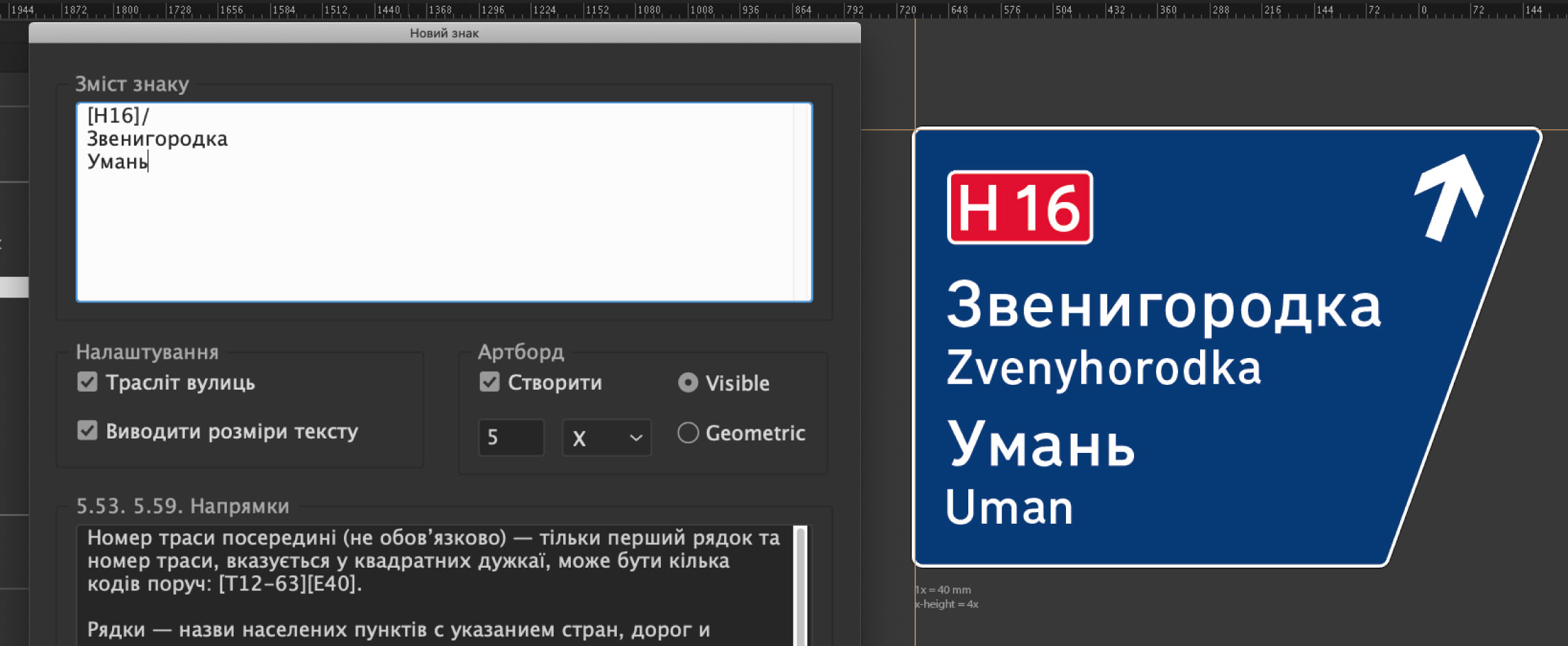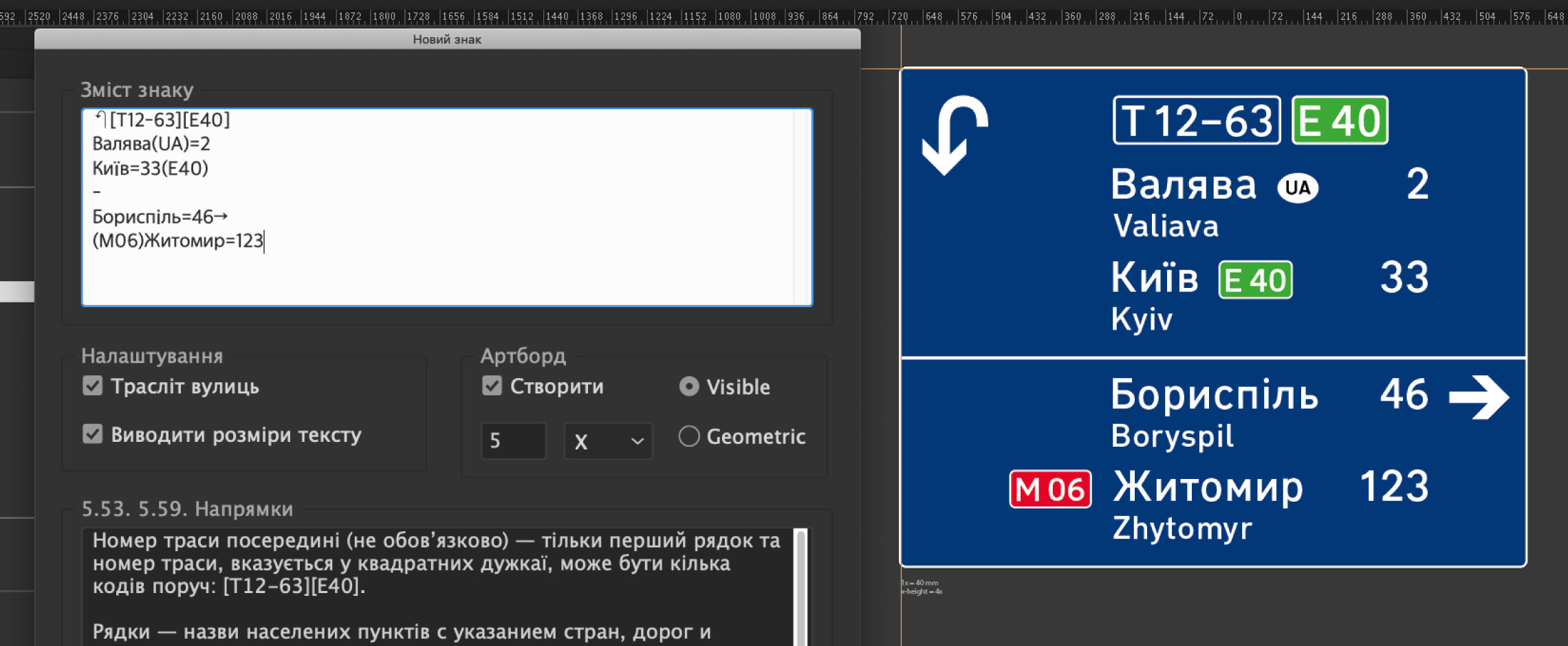 Вот примеры текстов от простого к более сложному, которые превращаются в готовый дорожный знак на отдельном артборде с указанием технической информации (легендой). В окне экстеншена также указаны все возможности шаблона: